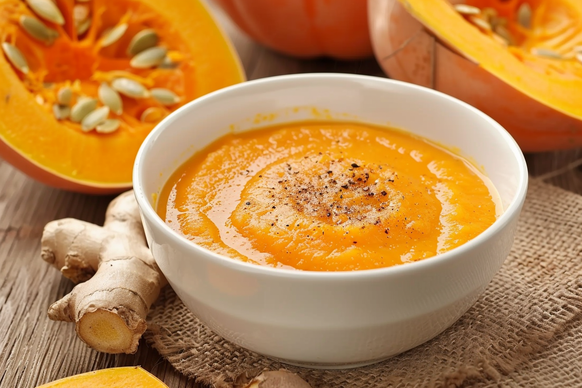Vyzkoušejte dýňovou polévku, která je vhodná pro vegany a má díky zázvoru a chilli prášku mírně pikantní chuť.