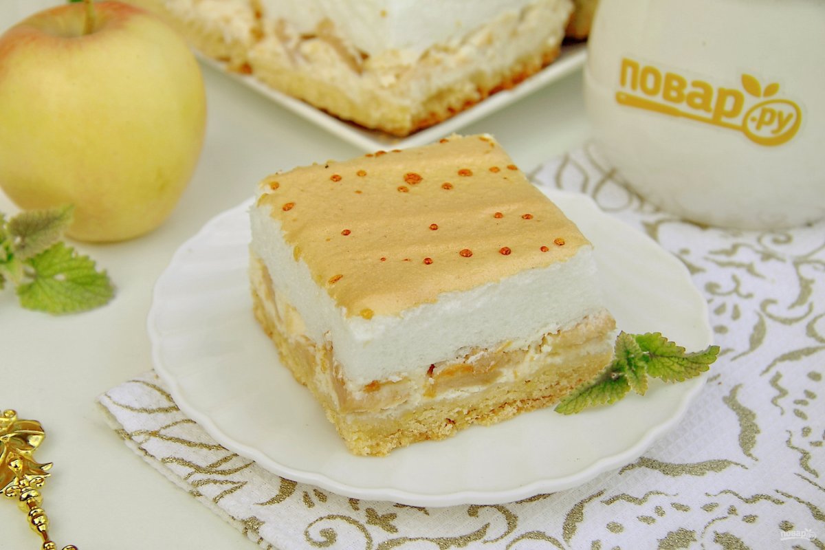 Připravte si meringu. Bílky vyšlehejte do měkkých špiček a postupně přidávejte cukr. Ten by se měl úplně rozpustit. Meringu nalijte na těsto a vložte znovu do trouby, jejíž teplotu snižte na 150 stupňů Celsia. Pečte dalších 10 minut.
